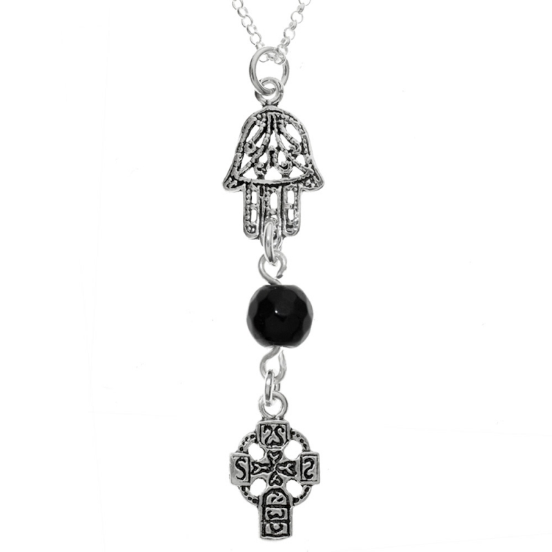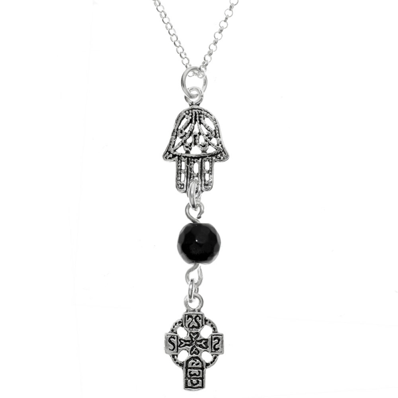 Amuleto doble diseño Mano de Fátima & Cruz celta con piedra ónix en el centro fabricado en Plata de Ley 925 con cadena roló incluida.