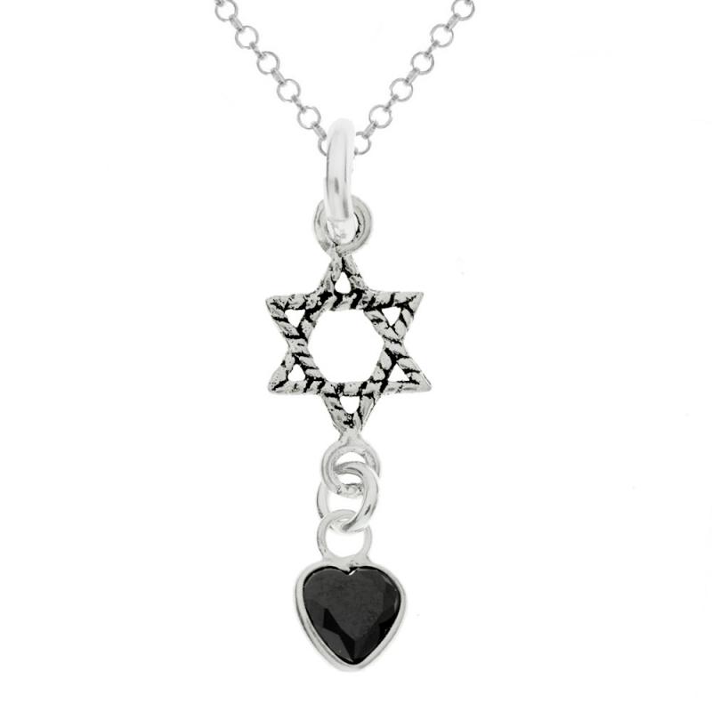 Collar con estrella de David y corazón de cristal negro fabricado en Plata de Ley 925 con cadena roló incluida.