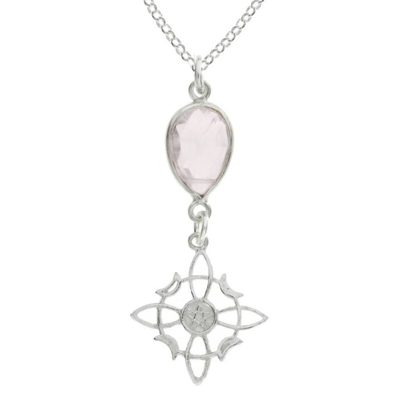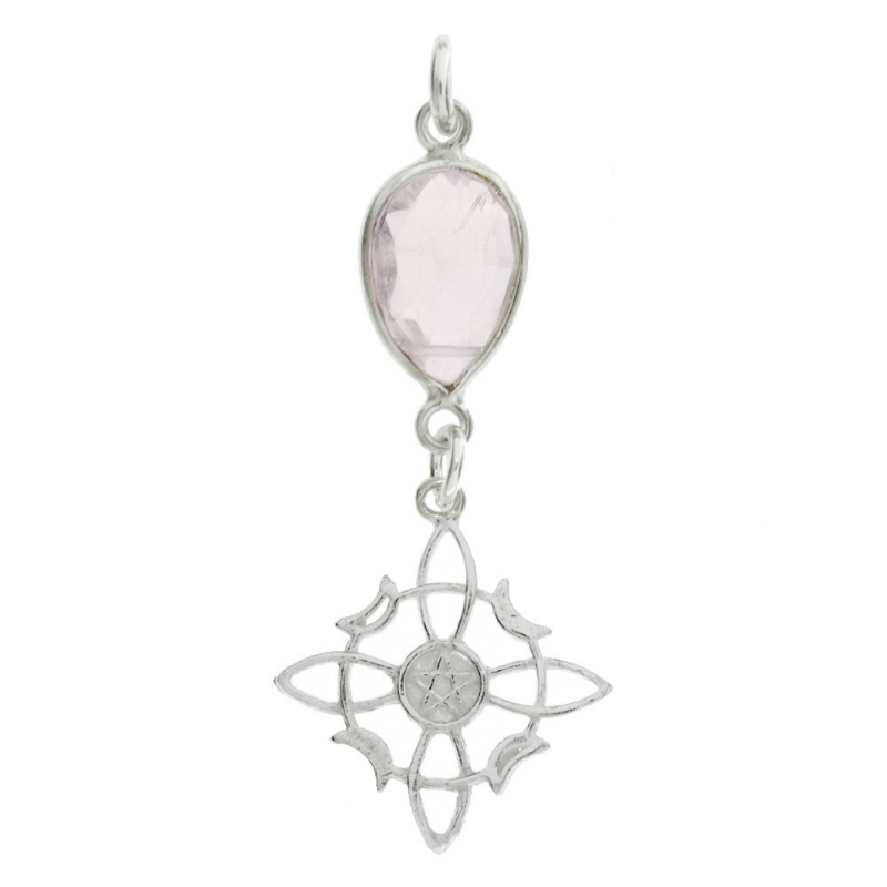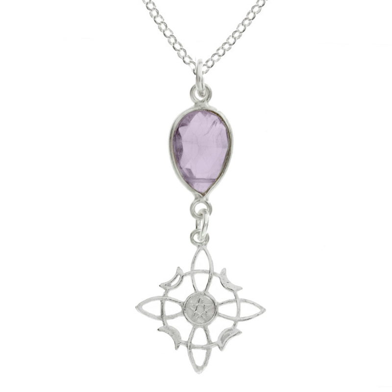 Colgante amuleto de protección con nudo de bruja y gota de amatista o cuarzo rosa fabricado en Plata de Ley 925 con cadena roló incluida.