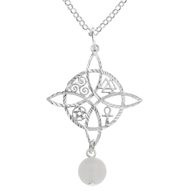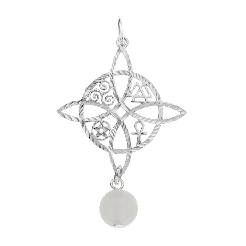 Colgante amuleto de protección con nudo de bruja con cuarzo blanco fabricado en Plata de Ley 925 con cadena roló incluida.