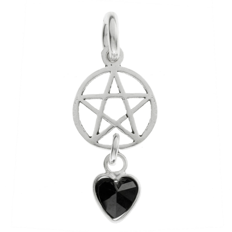 Collar amuleto diseño Pentagrama con corazón de cristal negro fabricado en Plata de Ley 925 con cadena roló incluida.