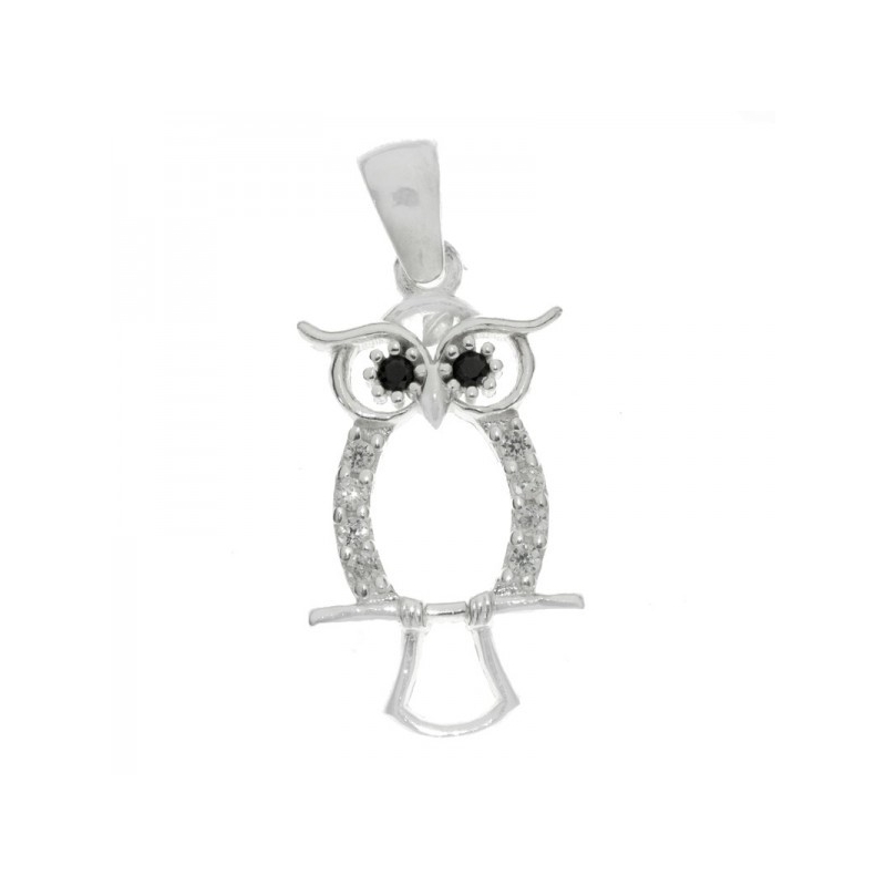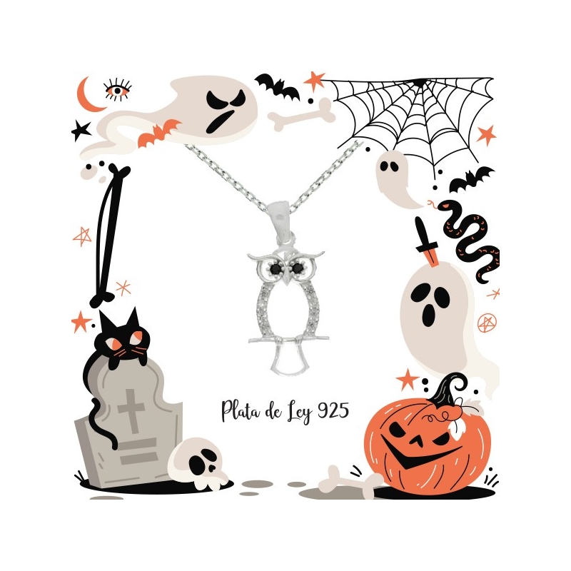 Colgante búho con circonitas fabricado en Plata de Ley. Incluye cadena de 45 cm.