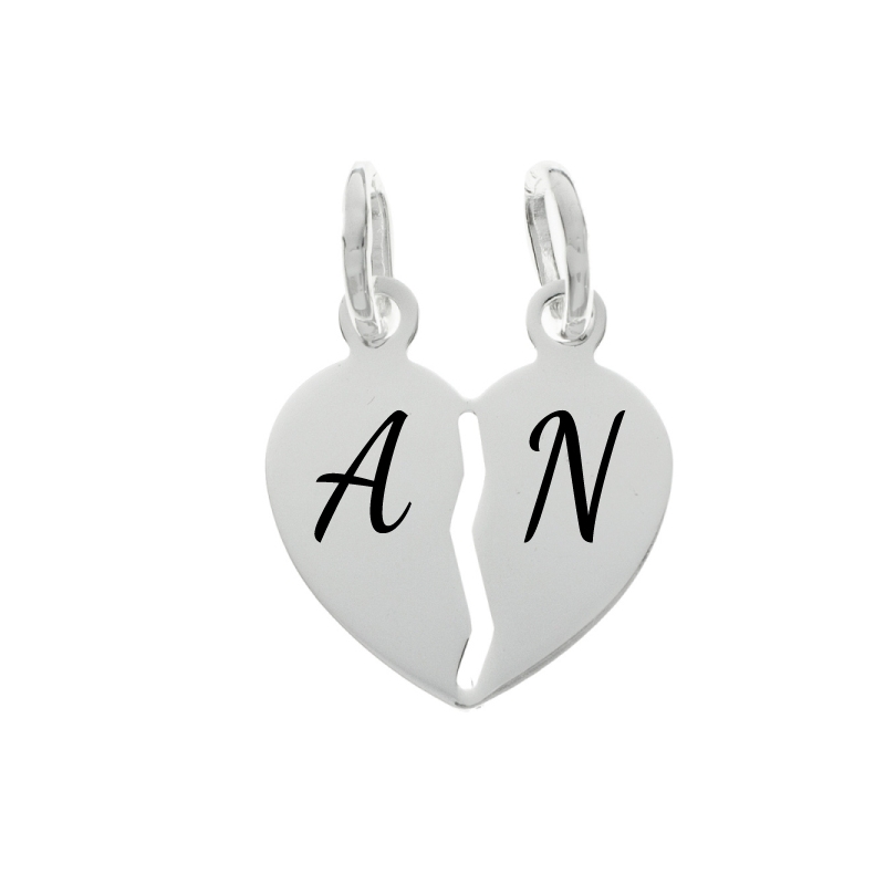 Colgante personalizado con iniciales grabadas con diseño corazón para partir en dos fabricado en Plata de Ley