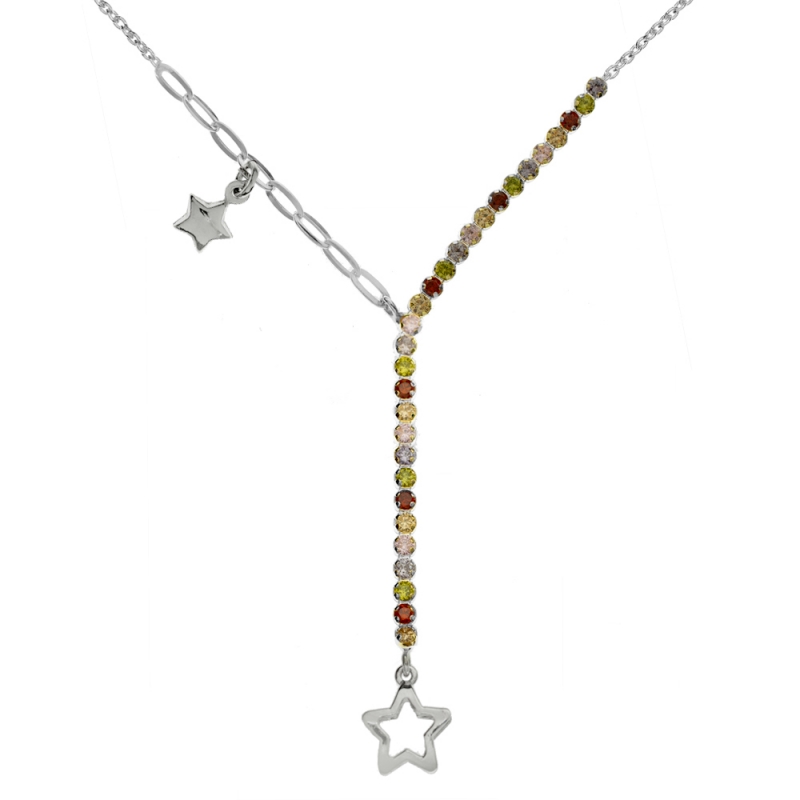 Collar corbatero con circonitas de colores y estrellas fabricado en Plata de Ley 925.