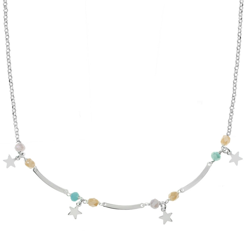 Collar con estrellas colgantes y cristales de colores facetados fabricado en Plata de 1ª Ley 925. Cadena roló y largo ajustable