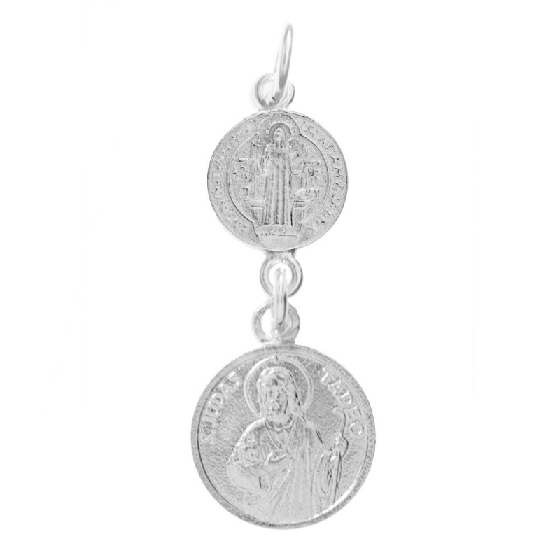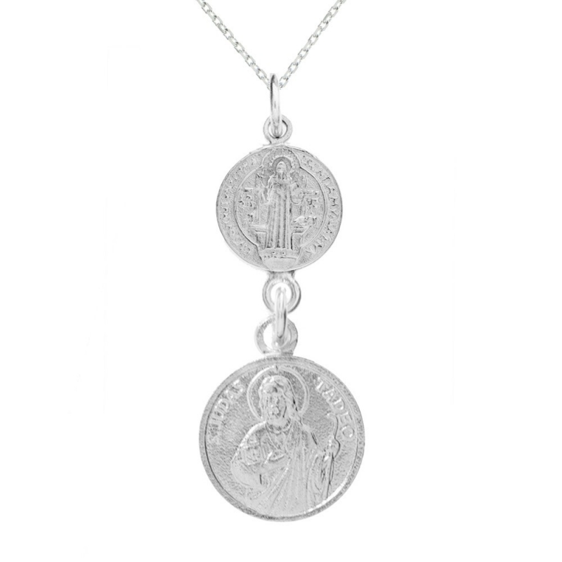 Medalla diseño doble con escapulario de San Benito y medalla de San Judas hecha en Plata de Ley 925