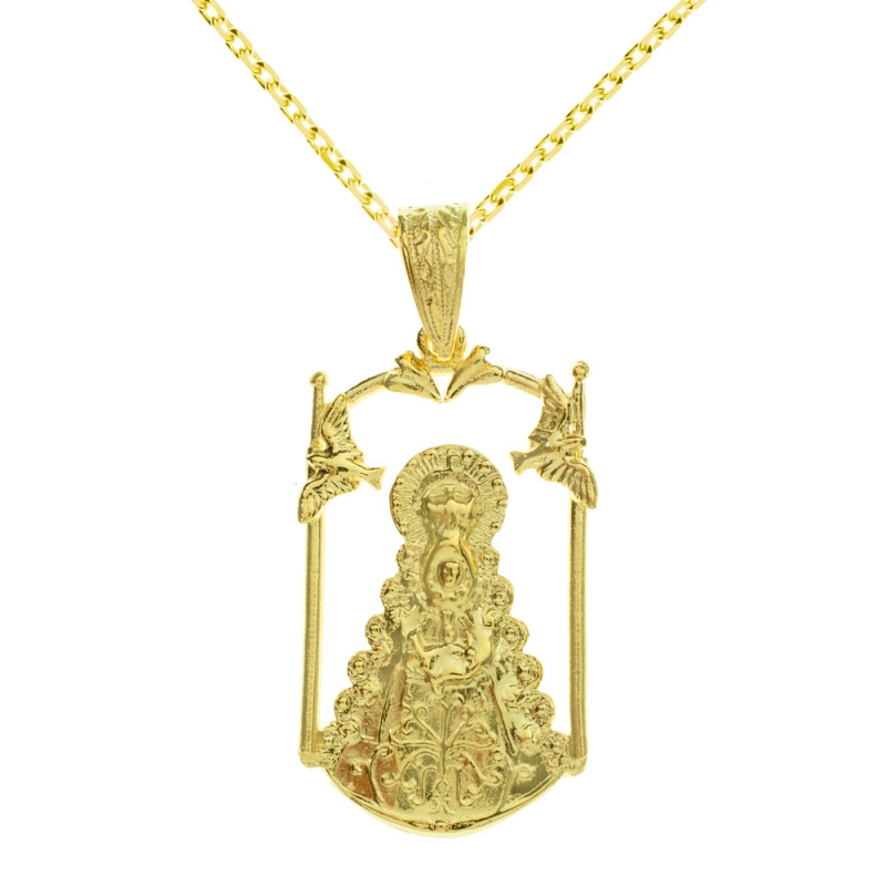 Medalla dorada Virgen del Rocío fabricada en Plata de Ley 925 bañada en Oro con cadena incluida.