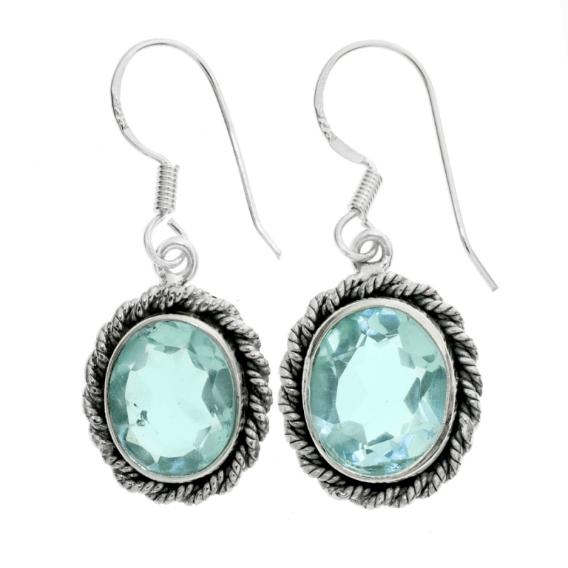 Pendientes largos de piedra natural aguamarina facetada en forma de óvalo con base perfilada con cordón enrollado fabricados en Plata de Ley 925 envejecida.