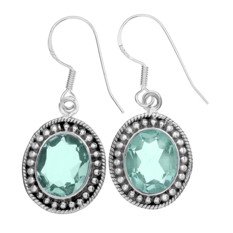 Pendientes largos de piedra natural aguamarina facetada en forma de óvalo con base punteada fabricados en Plata de Ley 925 envejecida.