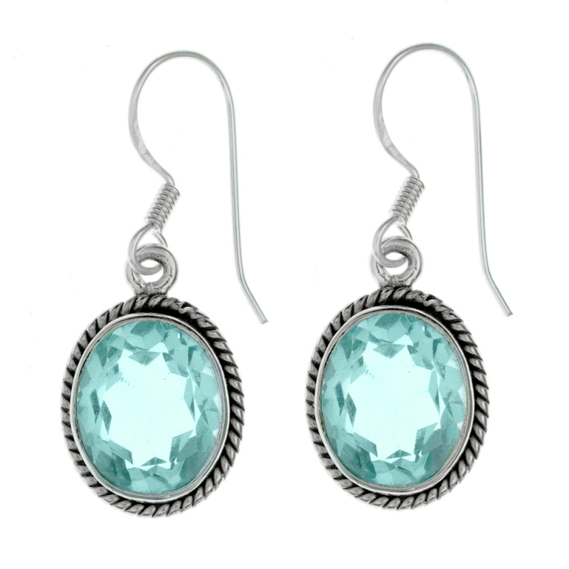 Pendientes largos de piedra natural aguamarina facetada en forma de óvalo con base perfilada con cordón fabricados en Plata de Ley 925 envejecida.