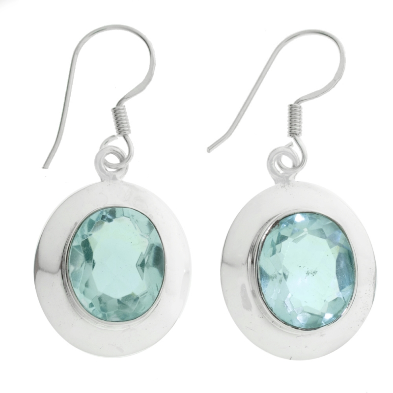 Pendientes largos diseño oval de piedra natural aguamarina facetada fabricados en Plata de Ley 925 con base bombé.