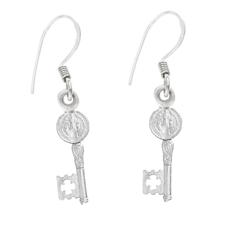 Pendientes largo con llave escapulario de San Benito fabricados en Plata de Ley