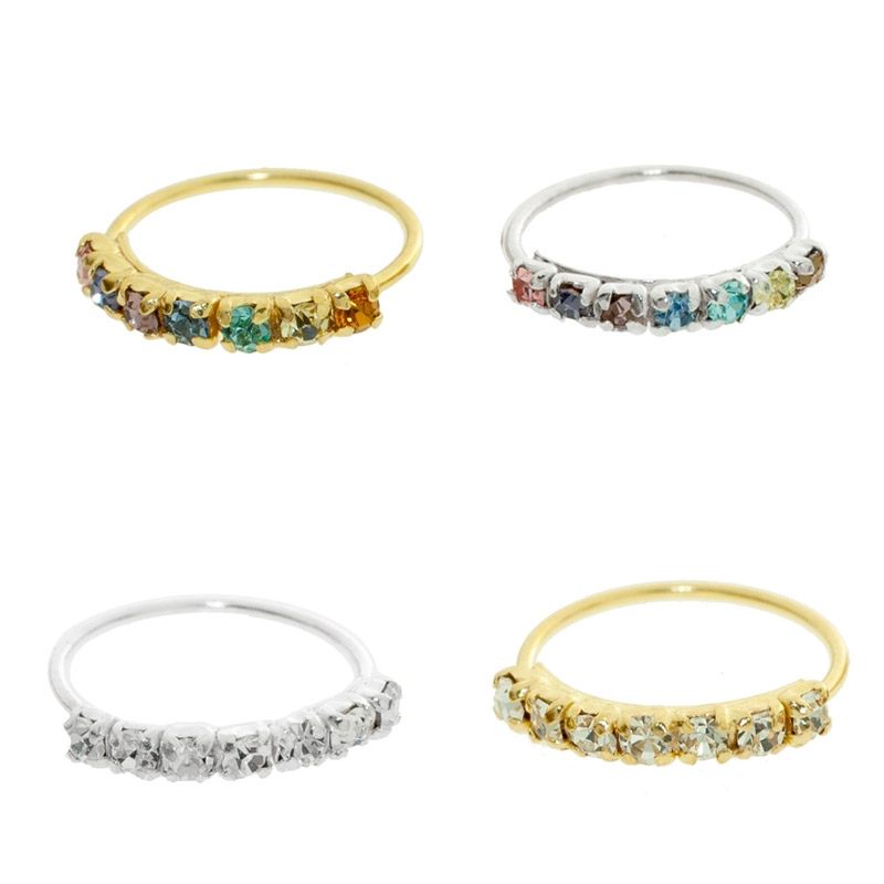 Piercing aro para nariz con circonitas blancas o de colores fabricado en Plata de Ley 925, bañado en Oro la versión dorada.