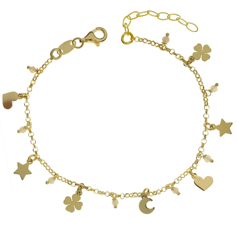 Pulsera dorada con abalorios colgantes y cristales facetados fabricada en Plata de Ley con baño de Oro