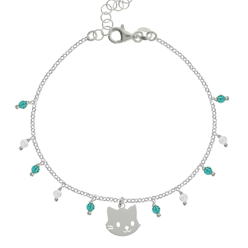 Pulsera con colgante gato y cristalitos facetados color azul fabricada en Plata de Ley 925.