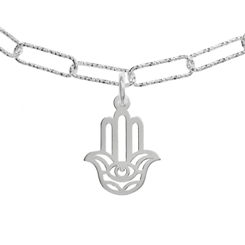 Pulsera ajustable eslabón estilo cadena con colgante mano de Fátima fabricada en Plata de Ley