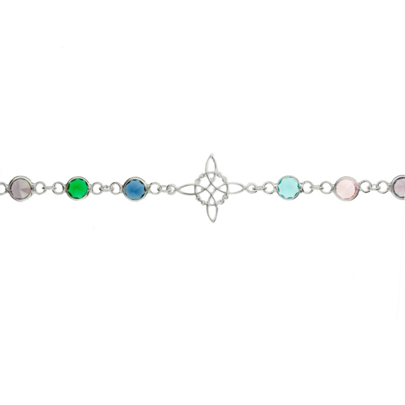 Pulsera amuleto de protección con Nudo de Bruja y cristales de colores fabricada en Plata de Ley 925.