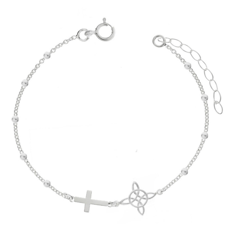Pulsera ajustable con cadena de bolitas, doble amuleto Nudo de Bruja & Cruz, fabricada en Plata de 1ª Ley 925
