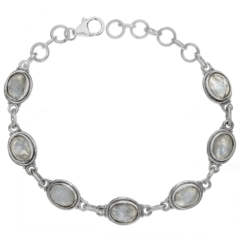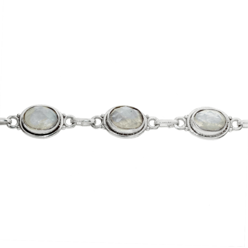 Pulsera étnica con eslabones de piedra de luna oval montados en Plata de Ley 925