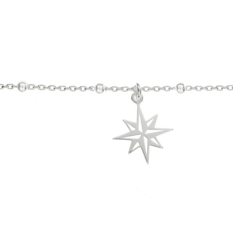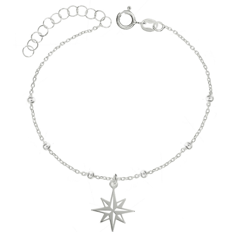 Pulsera ajustable con cadena de bolitas y colgante rosa de los vientos fabricada en Plata de 1ª Ley 925.