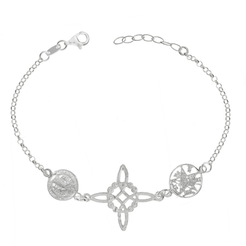 Pulsera triple amuleto de protección con Nudo de Bruja, escapulario de San Benito y tetragrámaton fabricada en Plata de 1ª Ley 925.