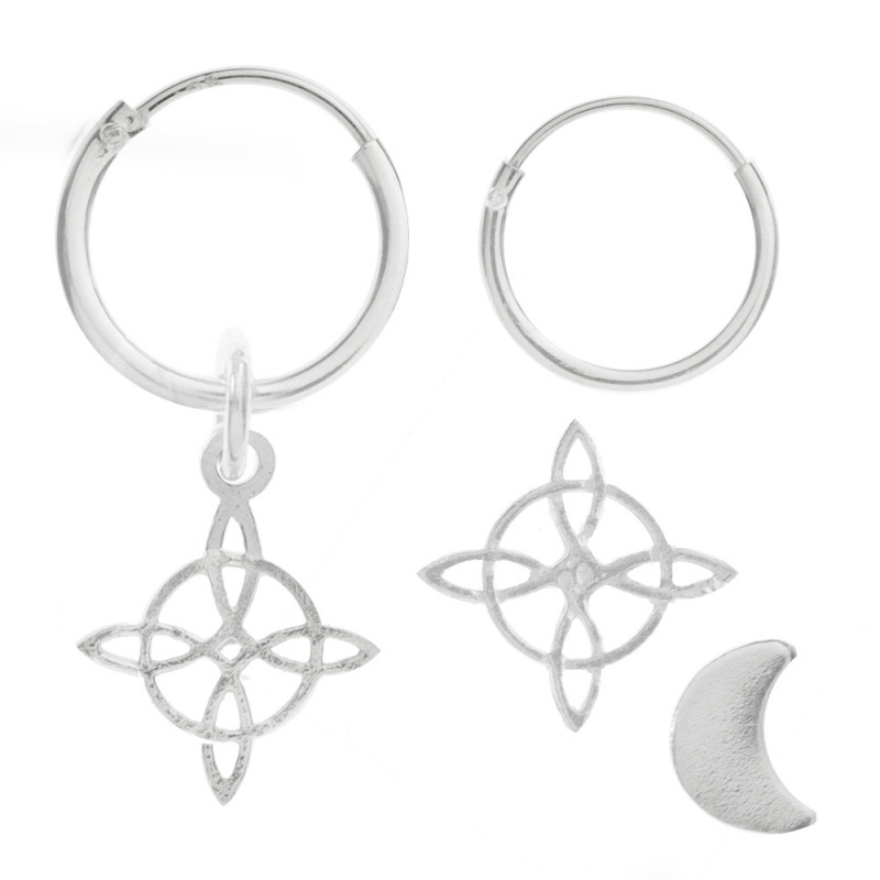 Set de 4 pendientes nudo de bruja Plata de Ley 925. Incluye: aro 12 mm con colgante nudo de bruja, aro sencillo de 10 mm, pendiente nudo de bruja y pendiente luna.